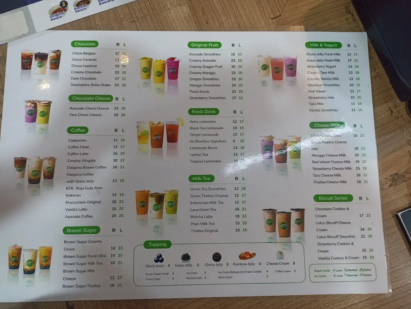 Melihat daftar menu Yotta yang begitu banyak, jelas bahwa mereka ingin menjangkau semua selera. Harga yang ditawarkan pun cukup kompetitif, terutama dengan adanya dua pilihan ukuran, Regular (R) dan Large (L), yang memungkinkan pelanggan memilih sesuai bujet dan kebutuhan.