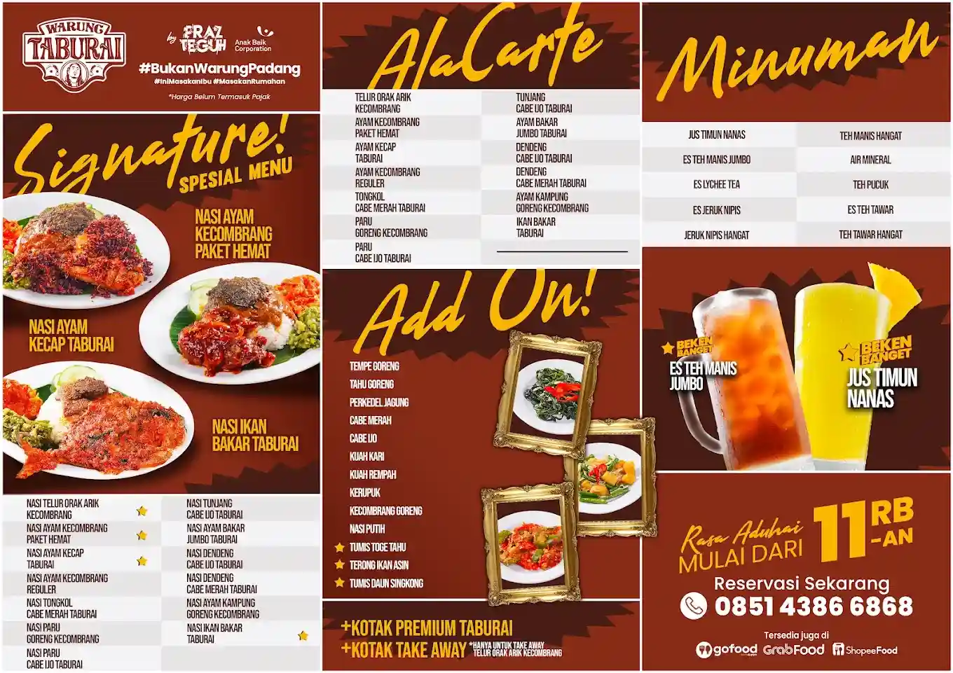 Berencana untuk makan di luar seringkali dimulai dengan satu pertanyaan sederhana yaitu “Makan di mana ya?” Dan ketika nama Warung Taburai muncul sebagai pilihan, pertanyaan berikutnya yang pasti menyusul adalah, “Di sana menunya apa saja, dan harganya berapa?”
